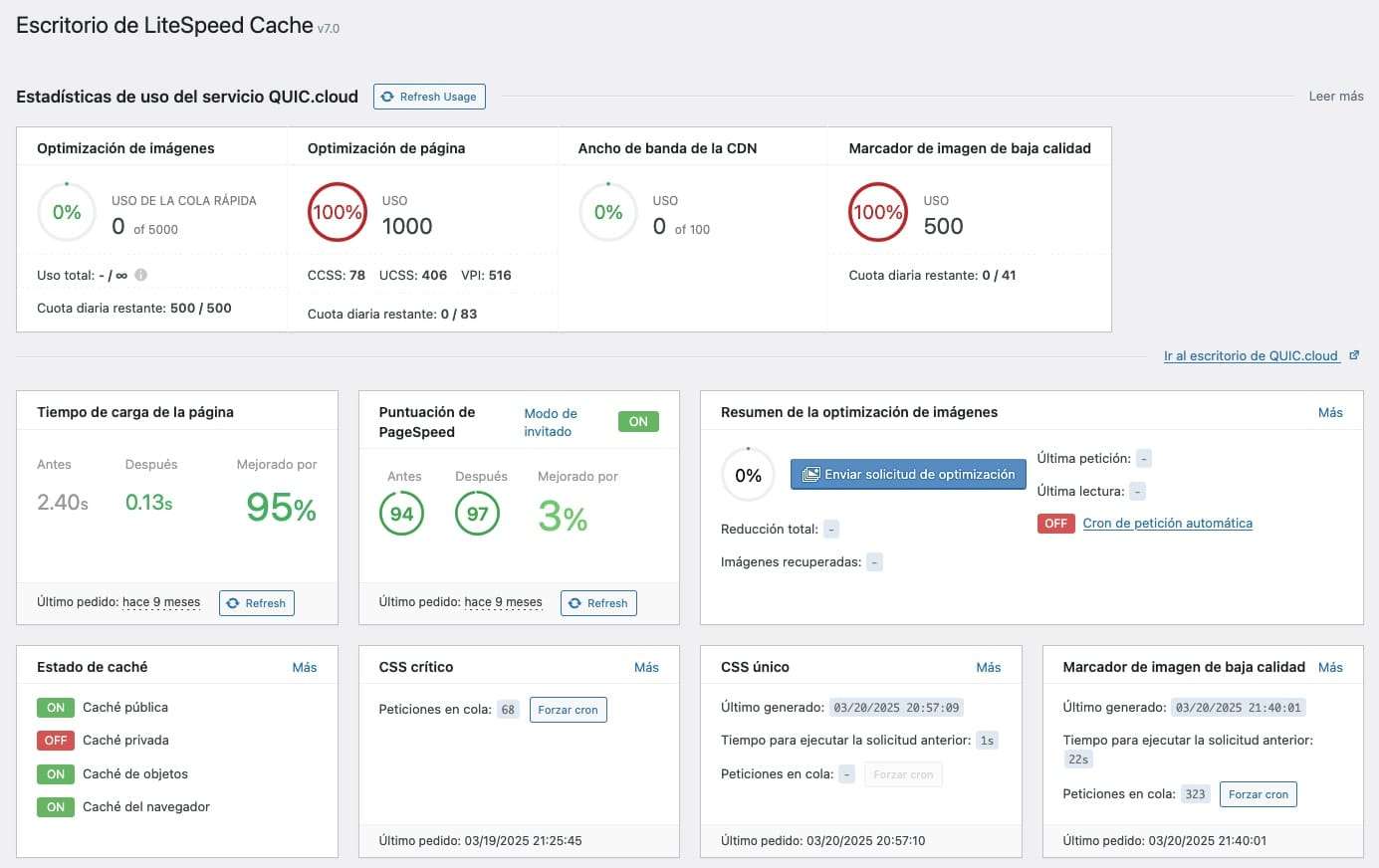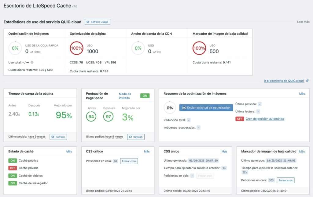 Para usuarios con servidores LiteSpeed Enterprise, OpenLiteSpeed o mediante la CDN QUIC.cloud, el plugin desbloquea funciones exclusivas como caché a nivel de servidor, purgado automático por eventos, cacheo privado para usuarios autenticados y cacheo de llamadas a la API REST de WordPress.